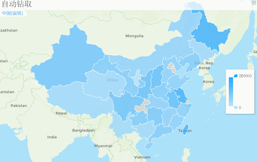 灵动的舞步(钻取、联动) 钻取地图: 新地图可以分层指定地图的数据和展示类型,意味着用户可以实现从区域地图钻取到点地图或者相反的效果。 同时也提供了交互更友好的自动钻取功能,不需要点击,只需要滚轮放大则自动进行钻取。 钻取与联动: