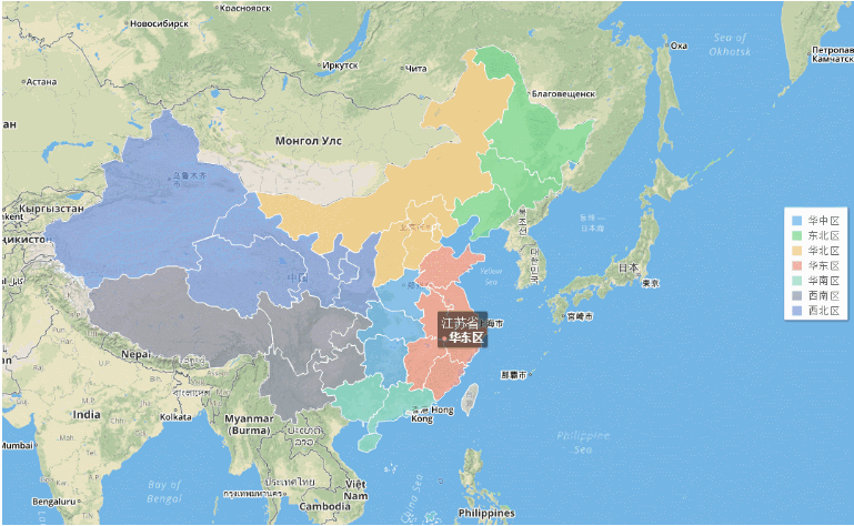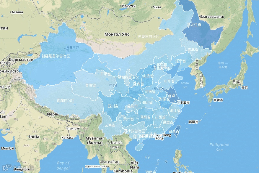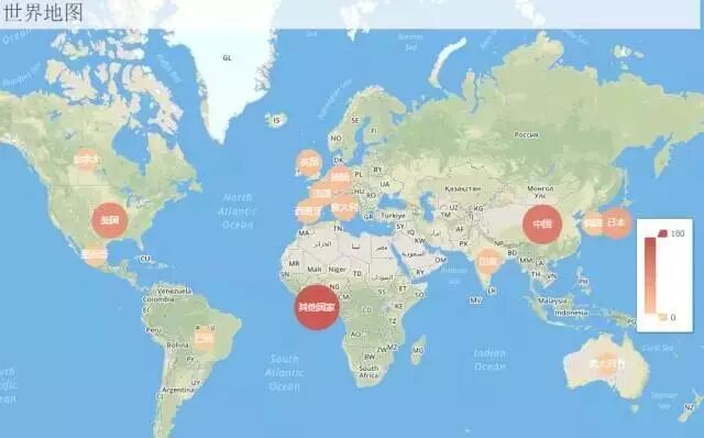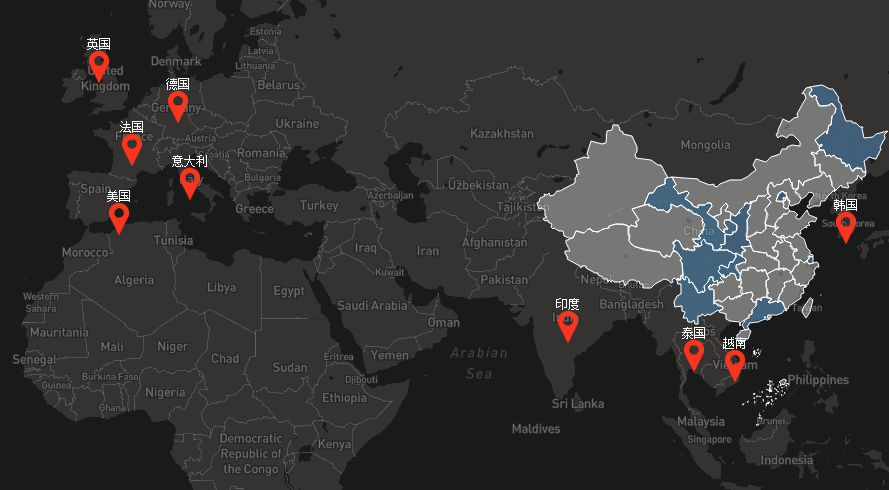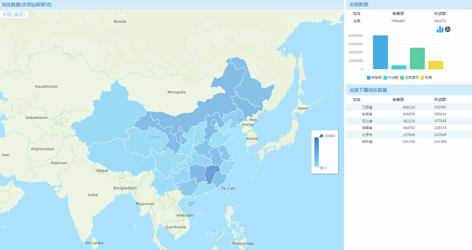 区域地图: 区域地图有三种图例形式,提供了更多的地图展示可能。如下图分别为热力地图和多系列式地图