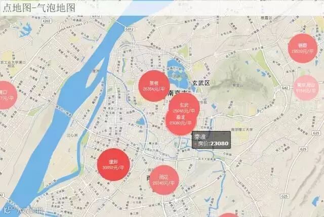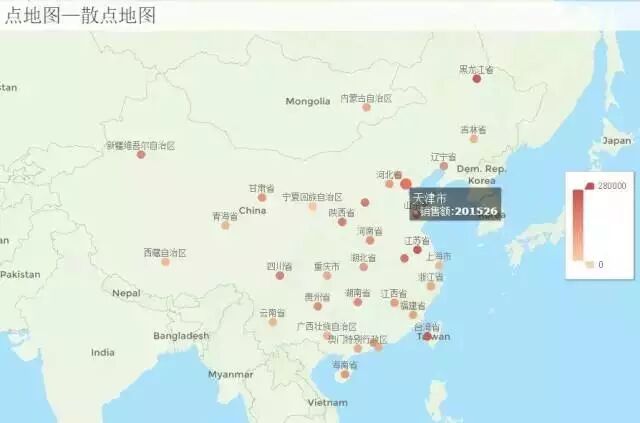 这周,国内报表分析工具FineReport在图表可视化方面又有了大动作, 新开发的地图功能可谓灵动新奇,亮瞎小编眼。 此项新开发的图表功能,将原本单一的地图和其他基础图表进行深度结合,利用FineReport在数据分析上强大的钻取联动功能,提供了灵活展现数据的呈现形式,避免了EXCEL开发的繁琐步骤,也避免了图标插件使用的不稳定性及高昂费用。 新的地图包括两种图表类型,单层地图和钻取地图。从图表能叠加展示的类型来区分的话,可以分为点地图(包括小图标,散点,气泡),区域地图(热力地图),以及组合地图。这几种地图,都包含gis地图和自定义地图两种方式。 散点地图: