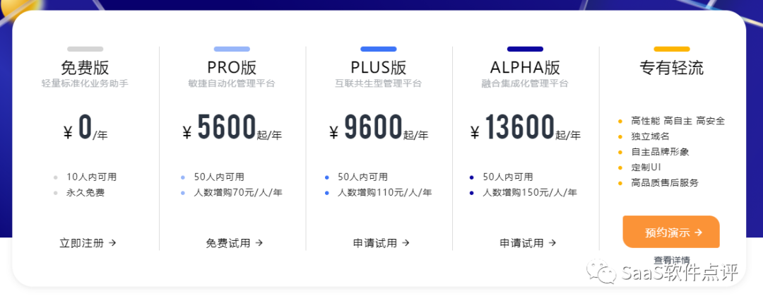 从官网公开信息可以看到,明道云分为四个版本,分别是免费版,PRO版5600元起/年、PLUS版9600元起/年、ALPHA版13600元起/年。还有专有轻流自定义程度更高,需联系官方工作人员。如需采购进群咨询可以获得专属优惠。