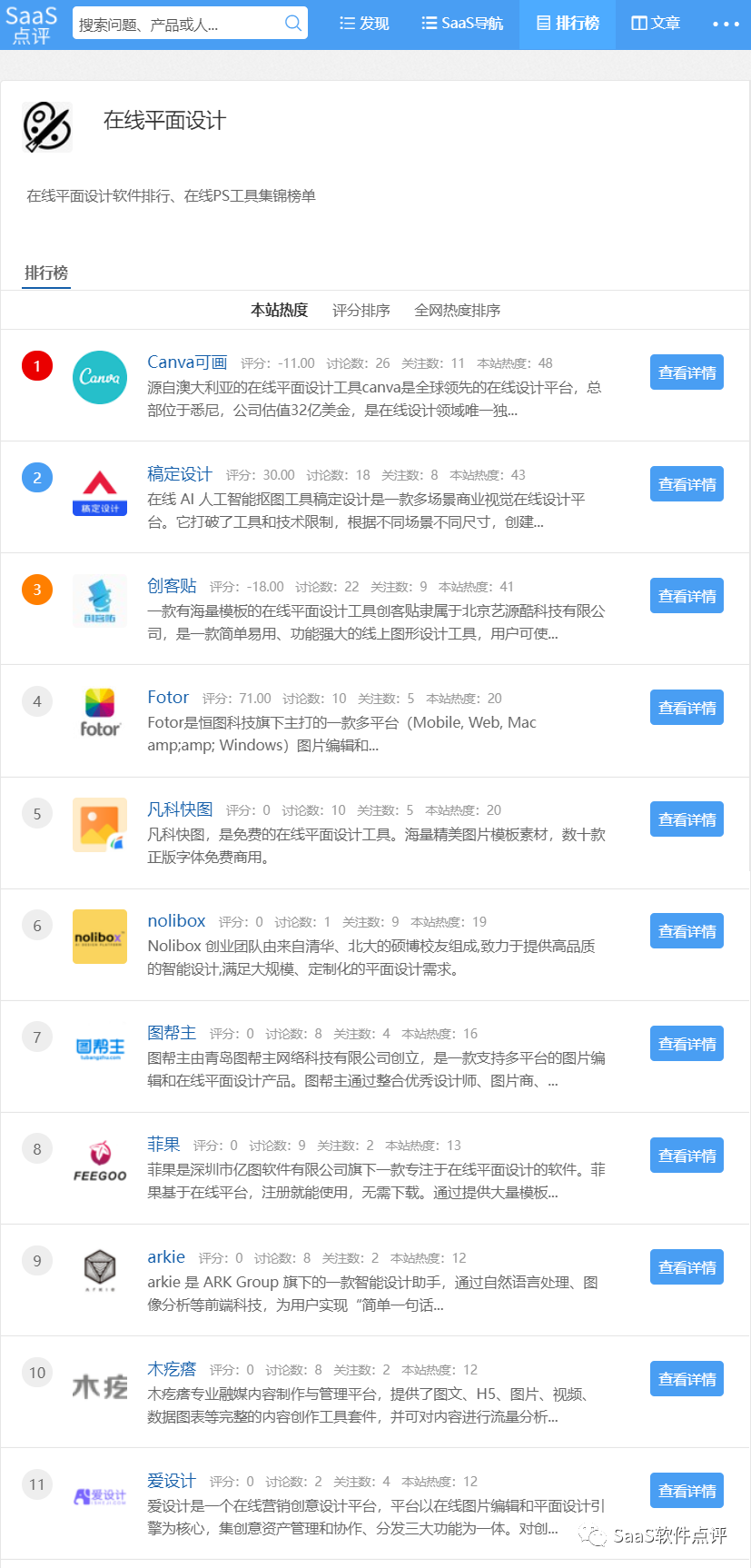 注:以上排序根据产品评分、站内外热度综合计算得出,会不断发生变化,截取日期为2021年11月25日。排名靠前的有 Canva可画、稿定设计、创客贴、Fotor、凡科快图等。