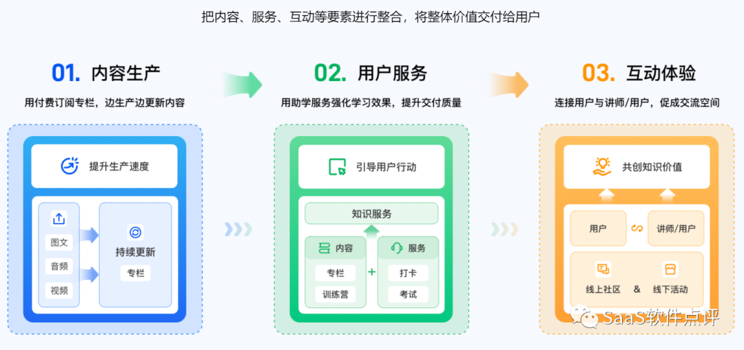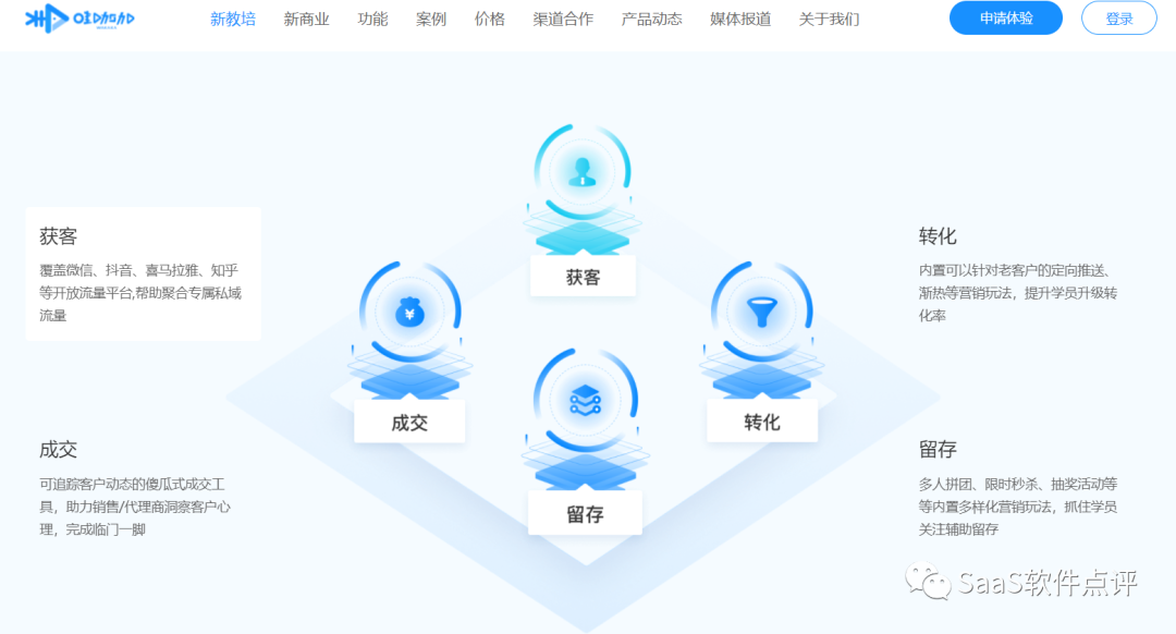 小鹅通把内容、服务、互动等要素进行整合,将知识商品生产的三大环节层层推进。教学和助教功能有图文、音频、视频、社群、付费问答、直播、打卡、训练营等。营销裂变手段有邀请码、好友助力、拼团、红包、秒杀、早鸟价、涨粉神器、商品推荐等。用户管理功能有表单、信息采集、超级会员等。同时解决内容交付、商业变现、服务体验和知识版权等问题。