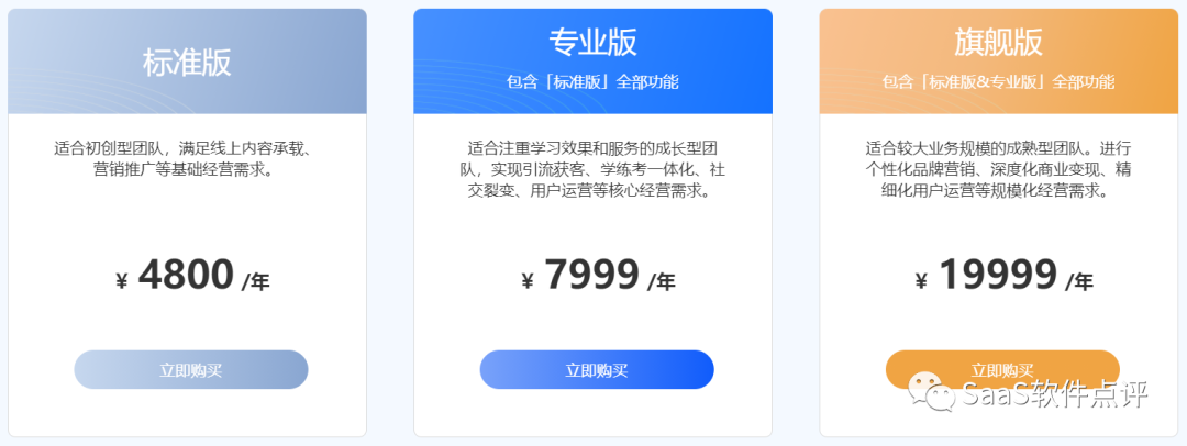 从官网公开信息可以看到,小鹅通把知识付费系统分为三个版本,分别是标准版4800元/年、专业版7999元/年、旗舰版19999元/年。