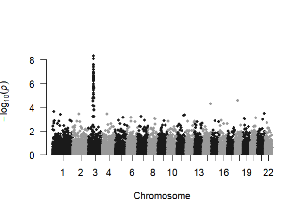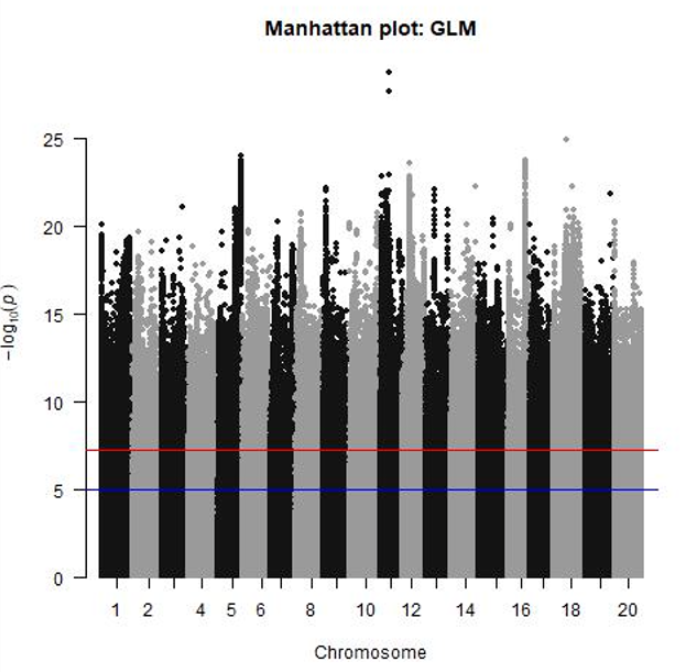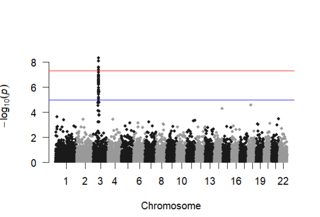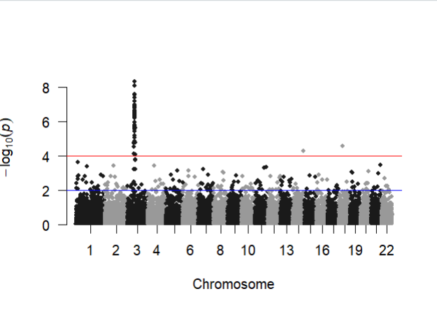 manhattan(gwasResults,suggestiveline = -log10(1e-2),genomewideline = -log10(1e-4))
