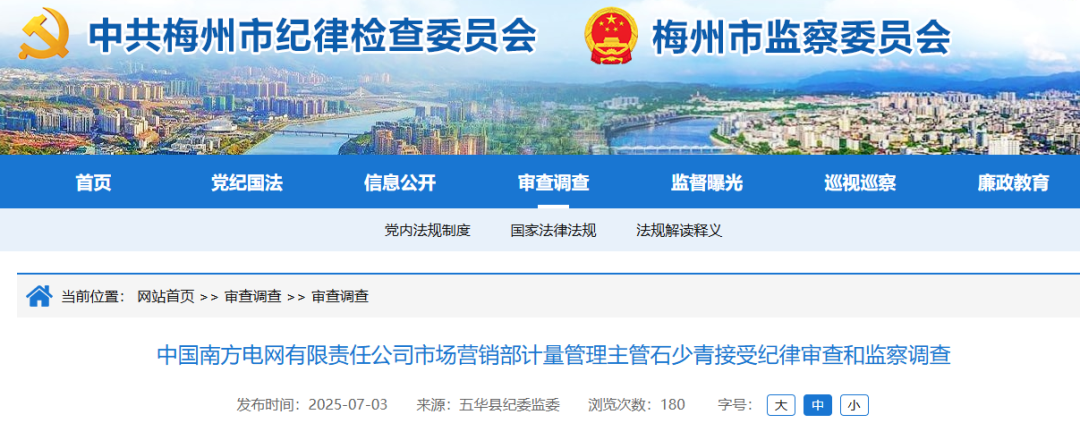 中国南方电网有限责任公司市场营销部计量管理主管石少青涉嫌严重违纪违法,目前正接受中央纪委国家监委驻南方电网纪检监察组纪律审查和梅州市五华县监委监察调查。