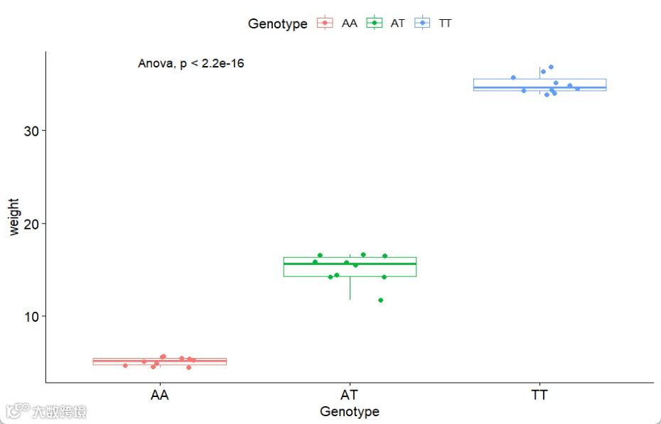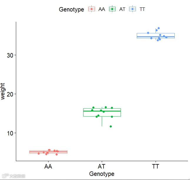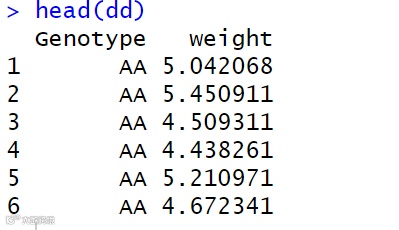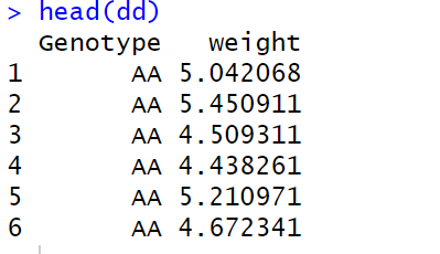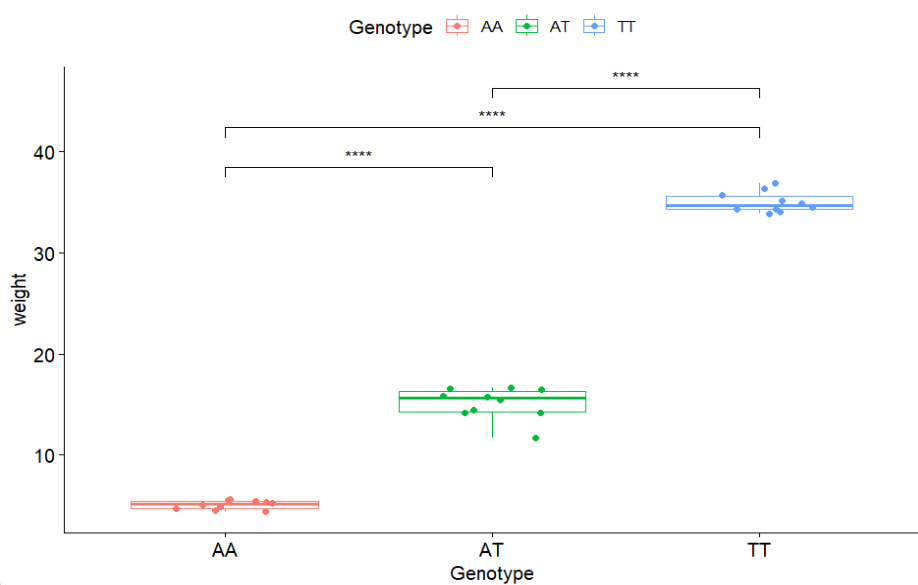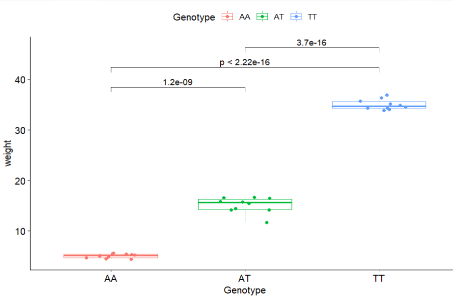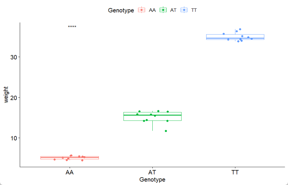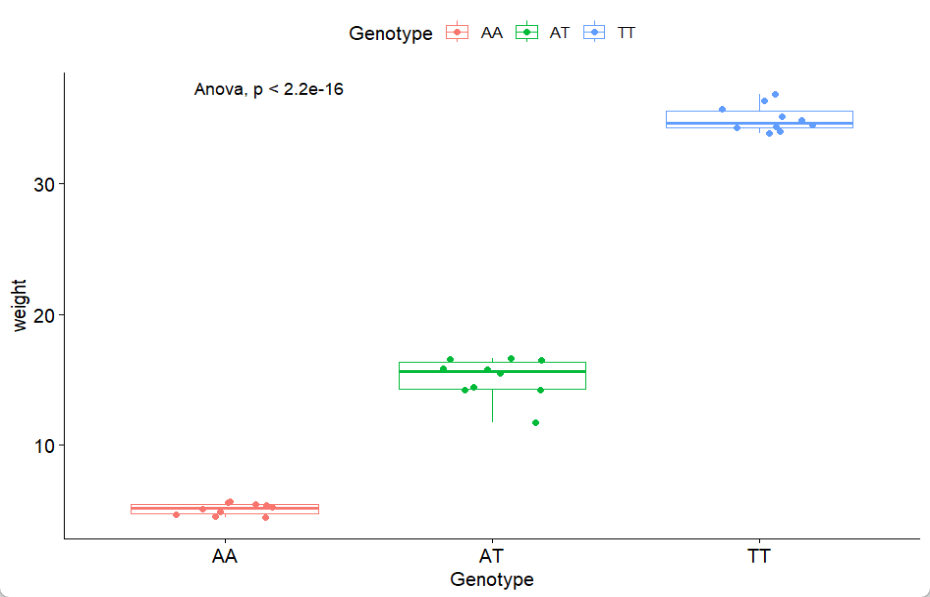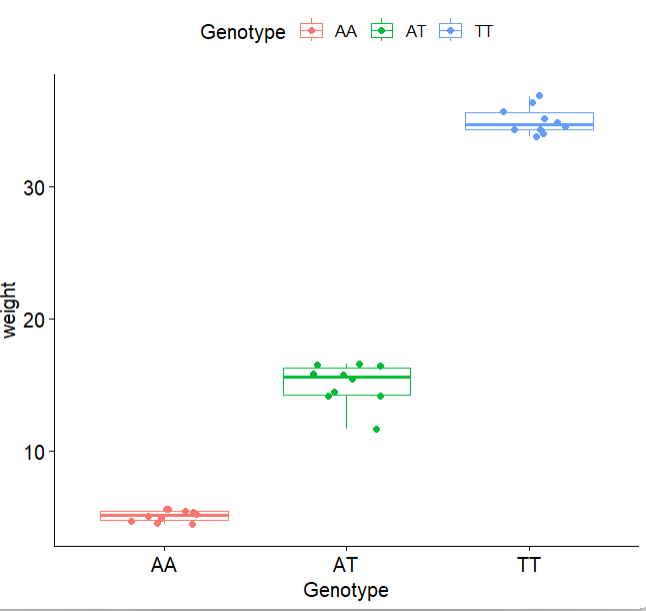 library(tidyverse)library(ggpubr)set.seed(123)y1 = rnorm(10) + 5y2 = rnorm(10) + 15y3 = rnorm(10) + 35dd = data.frame(Genotype = rep(c("AA","AT","TT"),each=10),weight = c(y1,y2,y3))dd