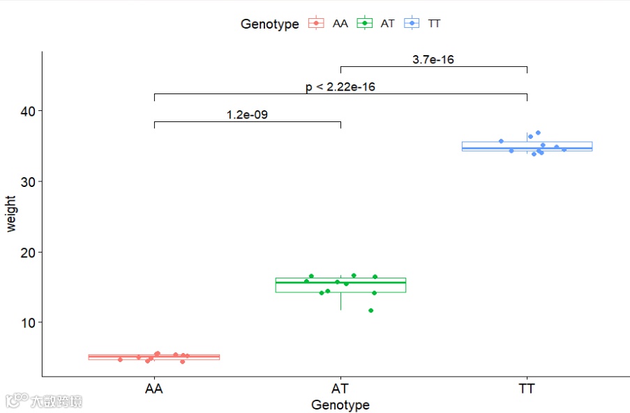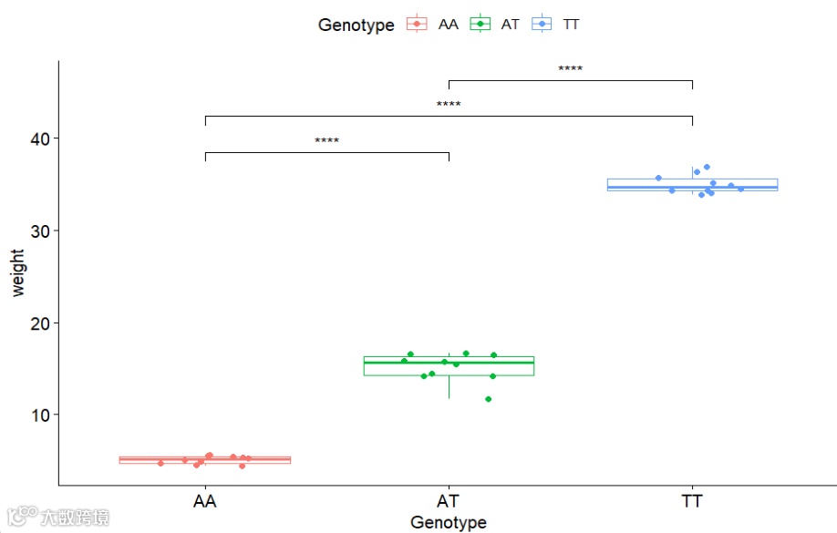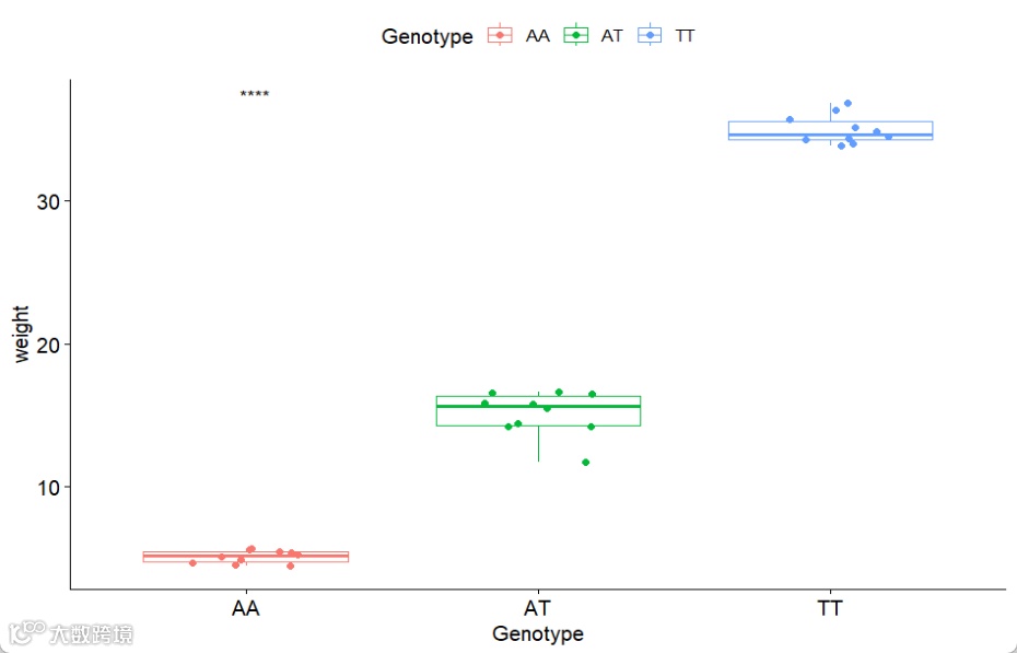 数据分析后,结果的可视化非常重要,比如GWAS分析后,将显著性位点进行可视化,AT的突变,共有AA、AT、TT三种基因型,比如对应的是体重,那么这三种基因型都有对应的体重,为了形象的展示出那种基因型更高,以及他们之间的显著性,做一个箱线图+显著性检验,无疑是最好的。