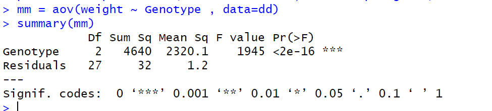 mm = aov(weight ~ Genotype , data=dd)summary(mm)