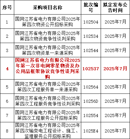 3、国网江苏7月预计发布一批电网零星物资采购;