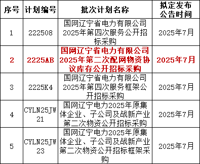 2、国网辽宁7月预计发布一批协议库存:国网辽宁省电力有限公司2025年第二次配网物资协议库存公开招标采购