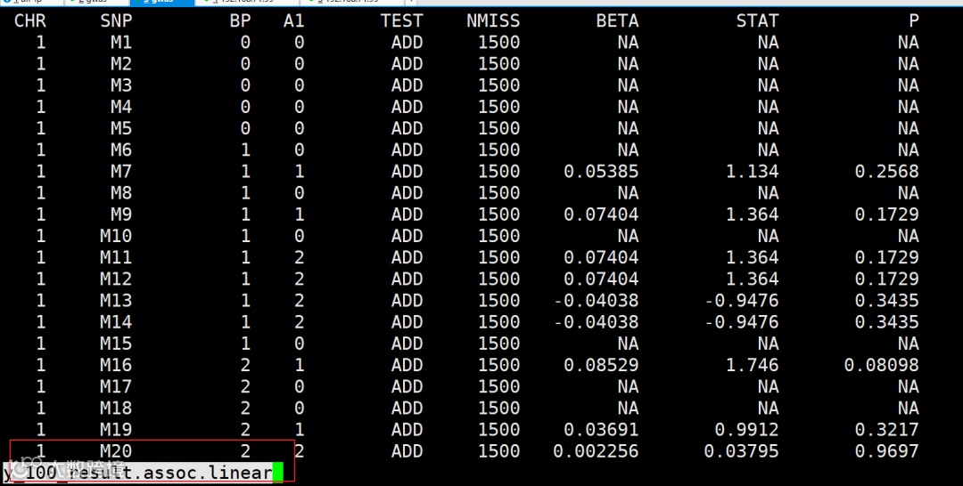 注意,上面基因型没有质控,所以有P值为NA的情况,正常质控的数据不会存在这种情况。