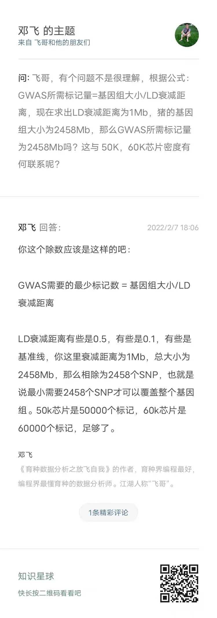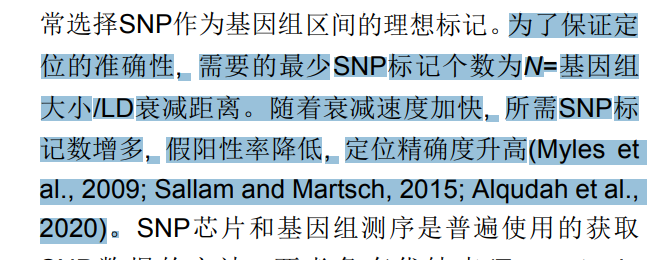 GWAS和GS分析中,都有一个假定:「假定至少有一个SNP标记与所控制性状的QTL(基因)处于连锁不平衡状态(LD)」,那怎么满足这个条件呢,就需要覆盖全基因组的标记,需要计算群体LD的衰减距离,进而计算进行GWAS分析时所需要的最少SNP的个数。