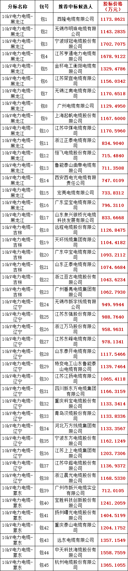 国家电网有限公司2025年东北区域第一次联合采购 10kV 电力电缆协议库存招标采购项目评标工作已经结束,依据《中华人民共和国招标投标法实施条例》、《招标公告和公示信息发布管理办法》对中标候选人公示的规定,现将评标委员会推荐的中标候选人予以公示,公示期 3 日。投标人或者其他利害关系人若对评标结果有异议的,请在中标候选人公示期间以书面形式(电子邮件)提出。