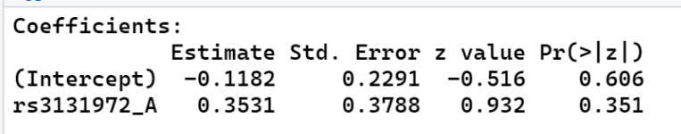m1 = glm(phe.V3 ~ rs3131972_A,family = "binomial",data=dd )summary(m1)