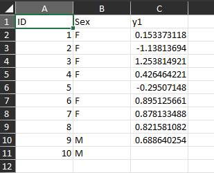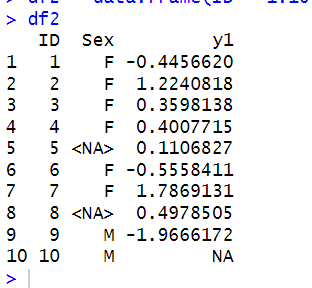 df2 = data.frame(ID = 1:10, Sex = c("F","F","F","F",NA,"F","F",NA,"M","M"), y1 = c(rnorm(9),NA))