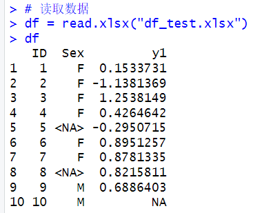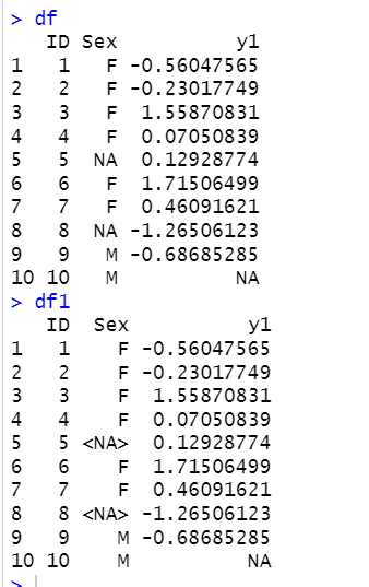df = data.frame(ID = 1:10, Sex = c("F","F","F","F","NA","F","F","NA","M","M"), y1 = c(rnorm(9),NA))