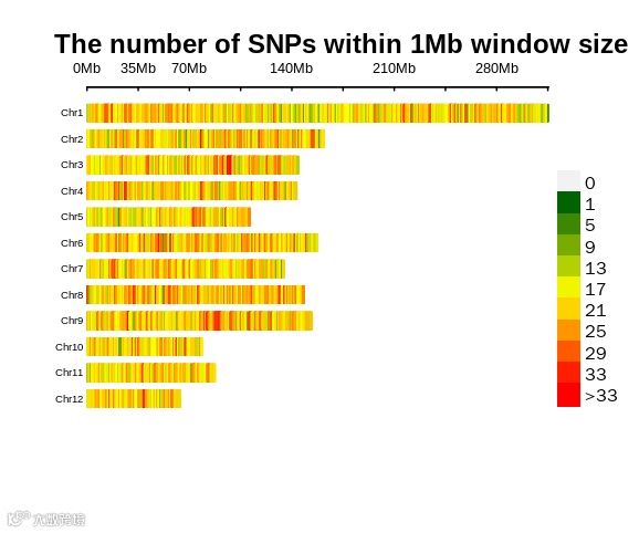 每个SNP在染色体上的分布图,也称为SNP密度图,不同的颜色表示1Mb内包含的SNP个数。