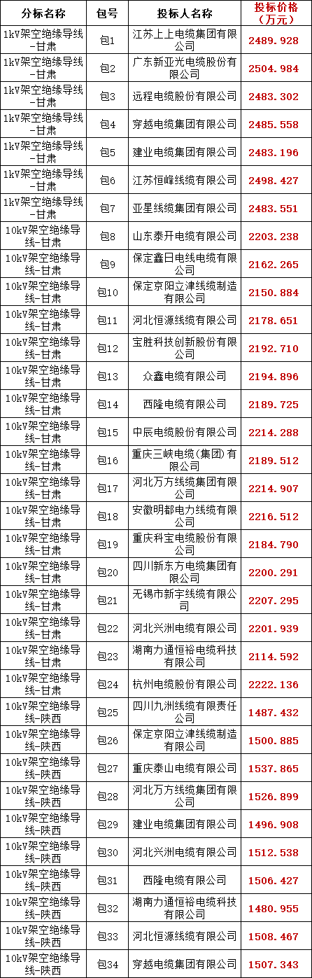 国家电网有限公司2025 年西北区域第一次联合采购架空绝缘导线协议库存招标(SG25O9)的中标候选人公示活动已经结束。现将中标人名单公告如下: