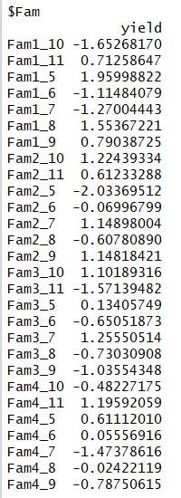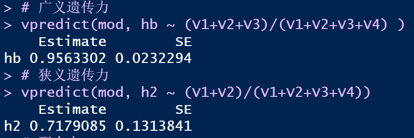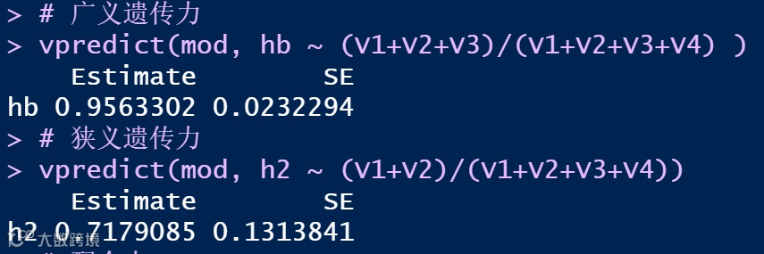# 没安装learnasreml# devtools::install_github("dengfei2013/learnasreml")library(learnasreml)data("NCII")dat = NCIIstr(dat)# 收费软件解决方案library(asreml)mod = asreml(yield ~ Block, random = ~ P1 + P2 + Fam, data=dat)summary(mod)$varcomp# 广义遗传力asreml::vpredict(mod, hb ~ (V1+V2+V3)/(V1+V2+V3+V4) )# 狭义遗传力asreml::vpredict(mod, h2 ~ (V1+V2)/(V1+V2+V3+V4))# 配合力coef(mod)$random# 免费软件解决方案library(sommer)mod = mmer(yield ~ Block, random = ~ P1 + P2 + Fam, data=dat)summary(mod)# 广义遗传力sommer::vpredict(mod, hb ~ (V1+V2+V3)/(V1+V2+V3+V4) )# 狭义遗传力sommer::vpredict(mod, h2 ~ (V1+V2)/(V1+V2+V3+V4))# 配合力randef(mod)