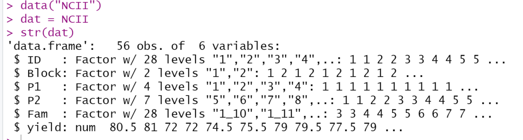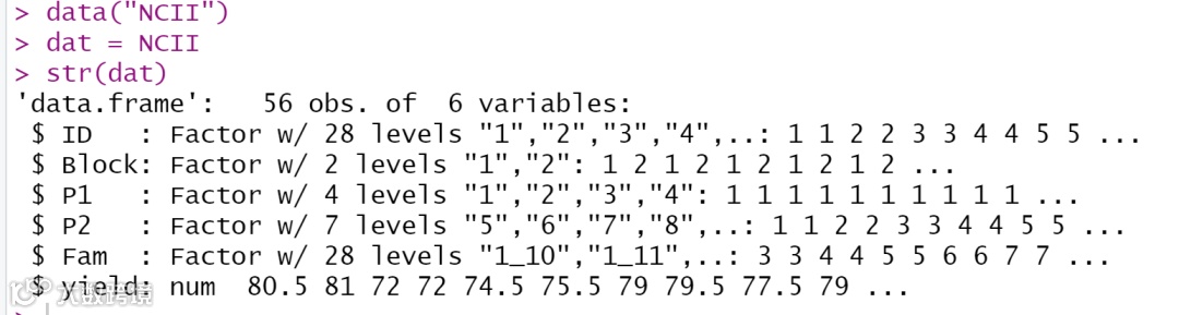 上面的数据,动物、植物,玉米,水稻,只要试验设计是NCII的试验,都可以用下面代码。