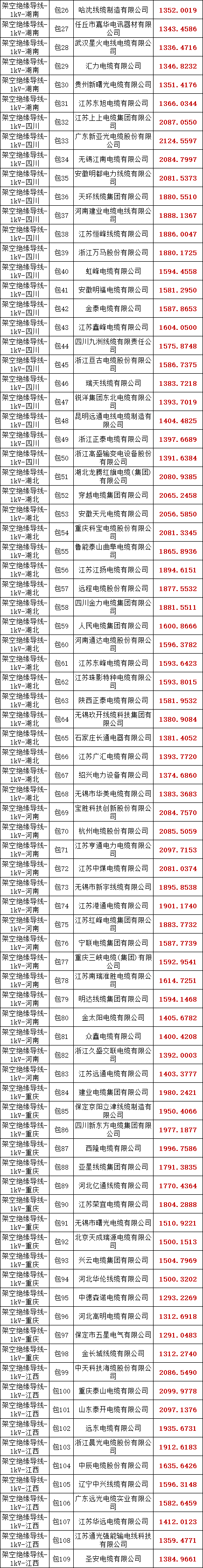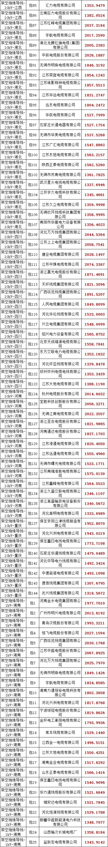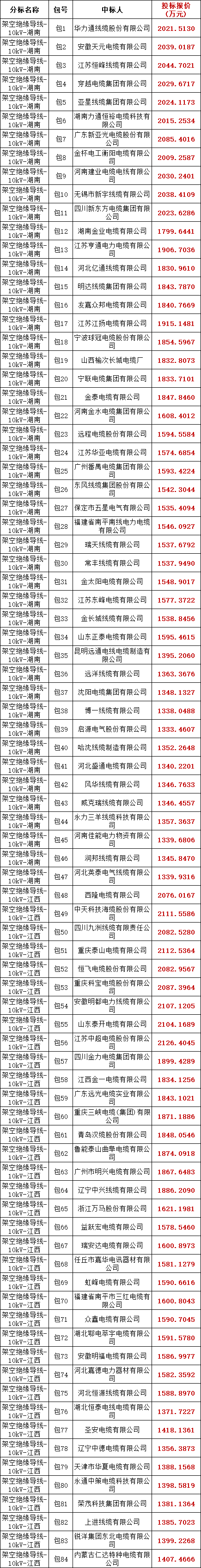 国家电网有限公司2025年华中、川渝区域第一次联合采购架空绝缘导线协议库存招标采购的中标候选人结果公示已结束,中标结果见下表。