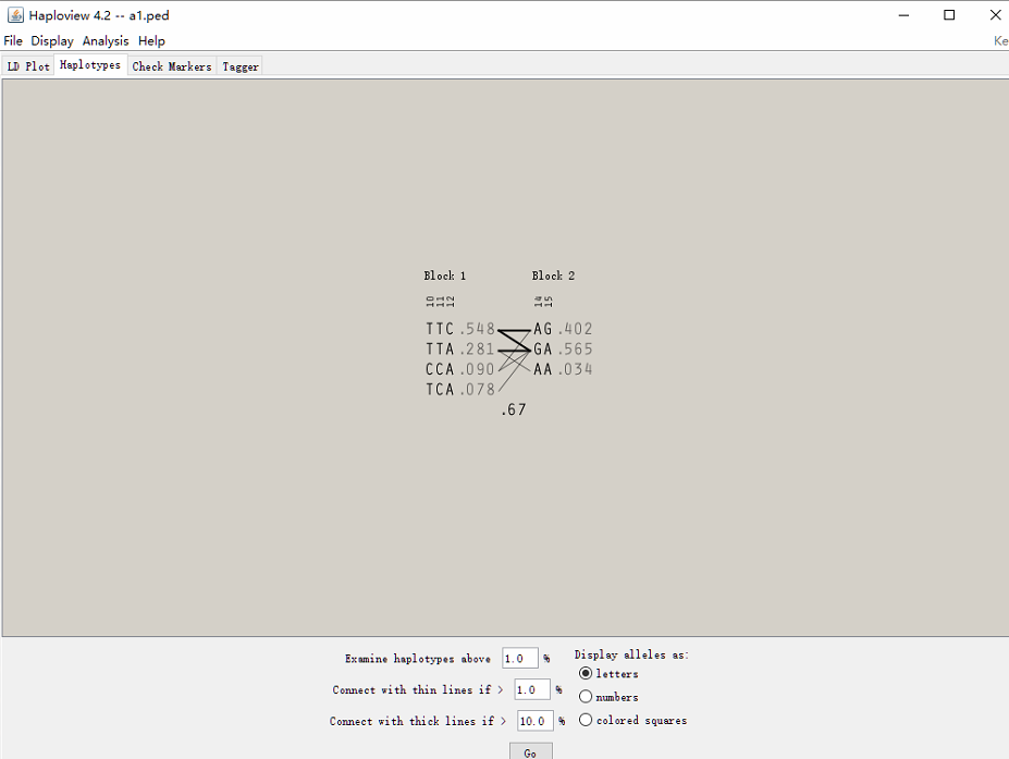 下图中,第一个block中,一共三个SNP,单倍型分别是:TTC,TTA,CCA,TCA,他们的频率分别是0.548,0.281,0.09和0.078,它们的频率之和为1。第二个block一共有两个SNP,单倍型分别是AG,GA和AA,频率分别是0.402,0.565,0.034,他们之间的频率之和为1.