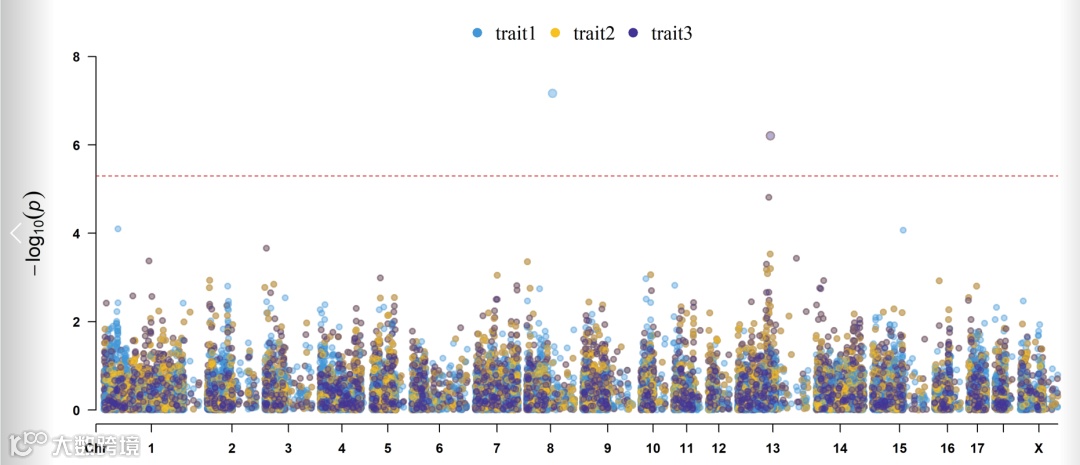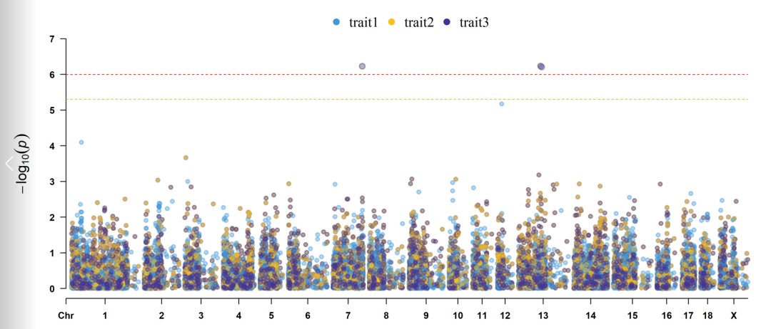 三个性状的曼哈顿图合并到了一张图上,用不同的颜色表示。蓝色的为trait1,黄色的为trait2,紫色的为trait3
