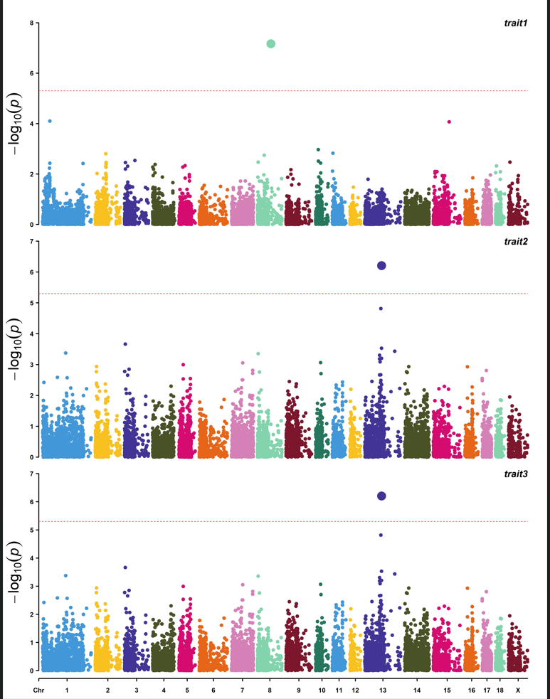 「叠加图:」三个性状的曼哈顿图,按照顺序进行了合并。最上面为trait1,中间为trait2,下面为trait3.