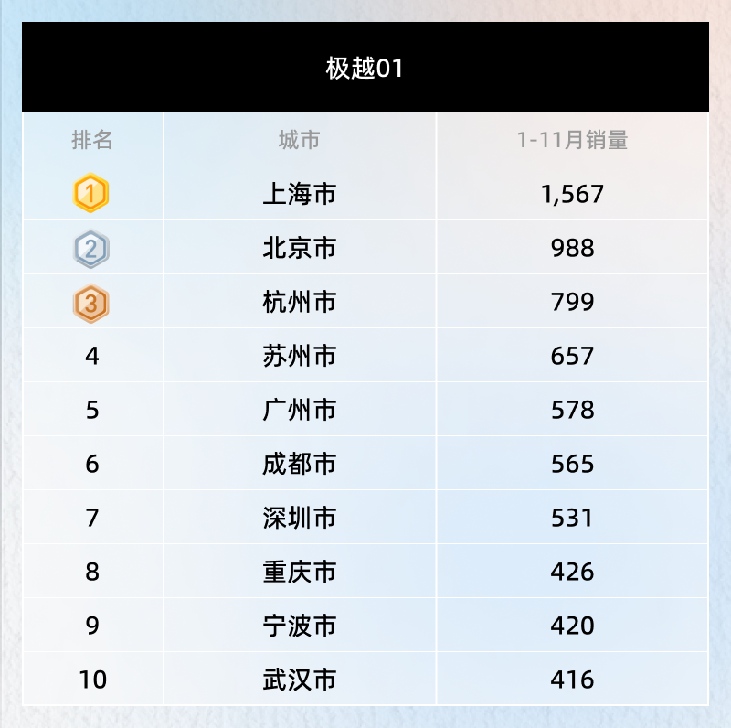 再看一个“彩蛋”,看一看刚倒下的极越,主要卖去哪里了。上海销量“遥遥领先”,周边长三角地区也占了较大份额,前十就有上海、杭州、苏州、宁波这四个长三角城市。