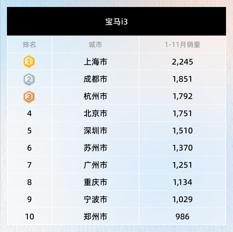 宝马i3卖得最多的城市是上海。宝马i3前十销量城市的构成,跟上面理想、问界等新势力车型比较类似。