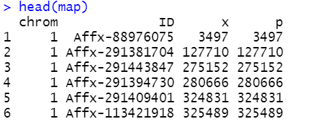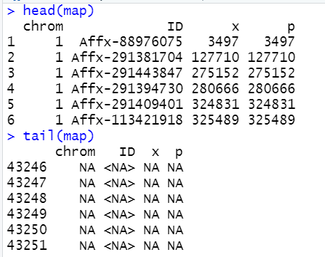 可以看到map有43251行,也就是有43251个SNP,ped比map多六列,因为第七列才是SNP的数据,结果没有什么问题。