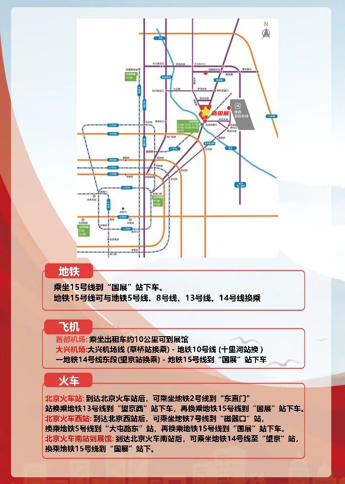 北京火车站:到达北京火车站后,可乘坐地铁2号线到“东直门”站换乘地铁13号线到“望京西”站下车,再换乘地铁15号线到“国展”站下车。