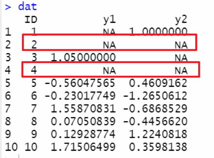 dat = data.frame(ID = 1:10,y1 = c(NA,NA,1.05,NA,rnorm(6)), y2 = c(1,NA,NA,NA,rnorm(6)))