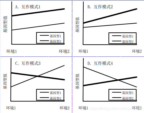 模式三:是交叉互作,基因型间差异的绝对值在两个环境下是相等的,这时的基因型效应为 0,只存在环境效应和互作效应 -