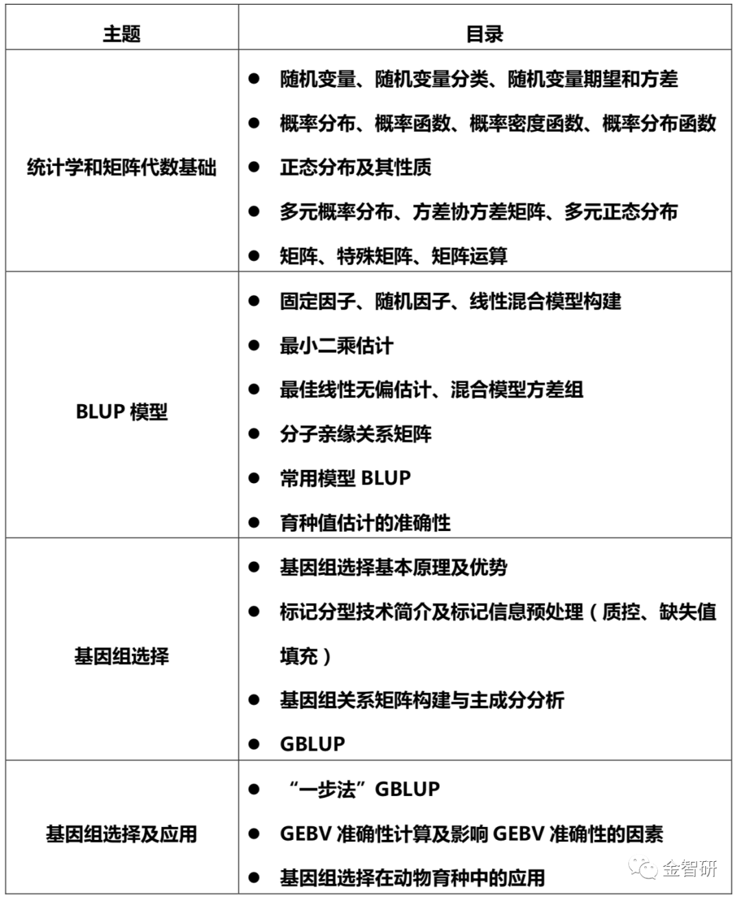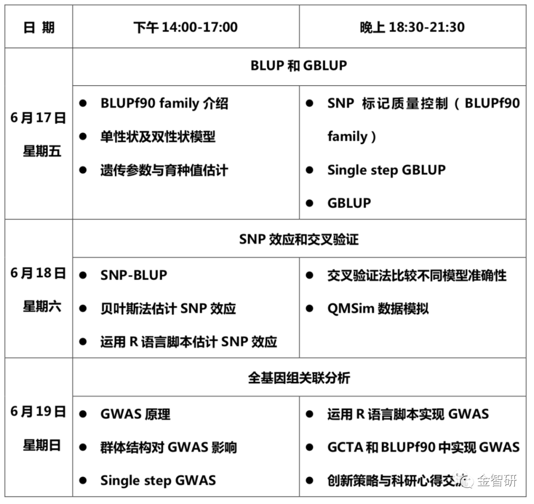 本次培训班,我们采用“理论知识视频观看+实操演练线上培训”的方式。理论课分别从统计学与线性代数基础、BLUP模型、基因组选择基本理论及应用等几个大的方面逐次展开进行详尽的讲解(详见《理论课课程目录》)。实操课,在衔接理论课教学内容的基础上,对课程作了精心策划,除了对基因组选择(GS)实操部分进行更加详尽的扩充之外,还增加了全基因组关联分析(GWAS)的理论教学与实践操作,采用R语言、BLUPf90、GCTA等常规软件,让学员实现从零基础到熟练应用的转变。另外,尹彤老师还会结合自己多年来的授课、科研经历,让大家在学习掌握GS与GWAS常规理论和软件操作的同时,与大家一起探讨GS的创新性发展并为大家分享她自身的创新策略与心得体会。
