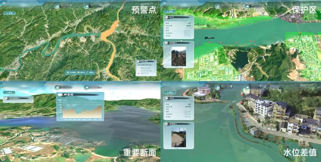 系统通过实时整合正射影像(DOM)、数字高程模型(DEM)和OSGB等2100平方公里的数据,并且对区域内包括桥梁、水坝、建筑物、道路和农田在内的重点设施进行了数据建模。此外,该系统还接入了114个流域断面、242个预警点和67个保护区计算数据等信息,并通过先进的可视化技术,将复杂的洪水演进过程以直观、易懂的方式展现出来。