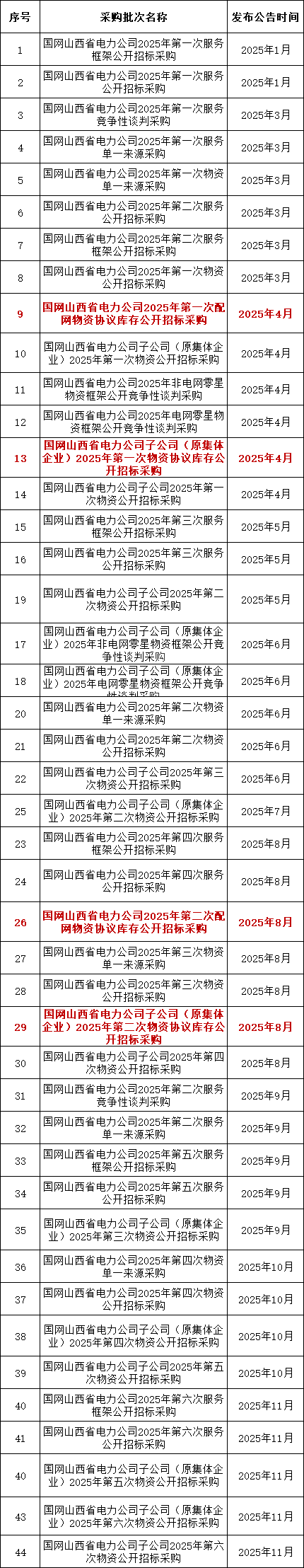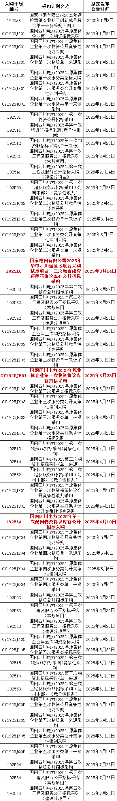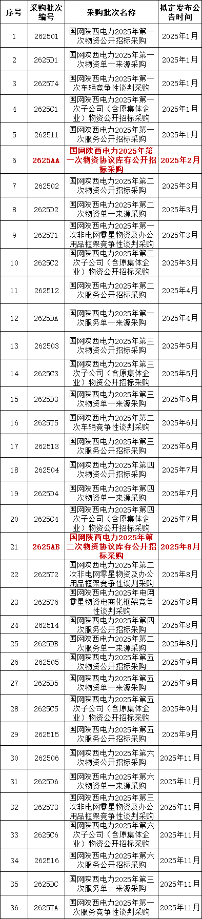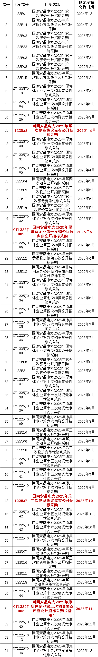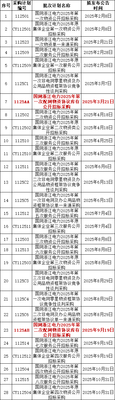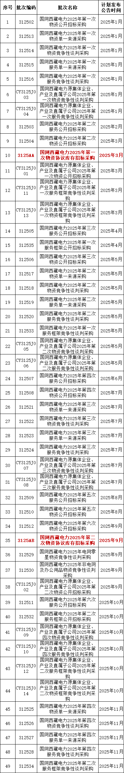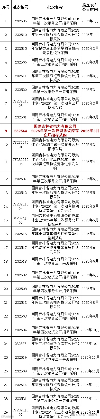截止日前国家电网共27个省市电力公司已全部发布完2025年集中采购批次安排;