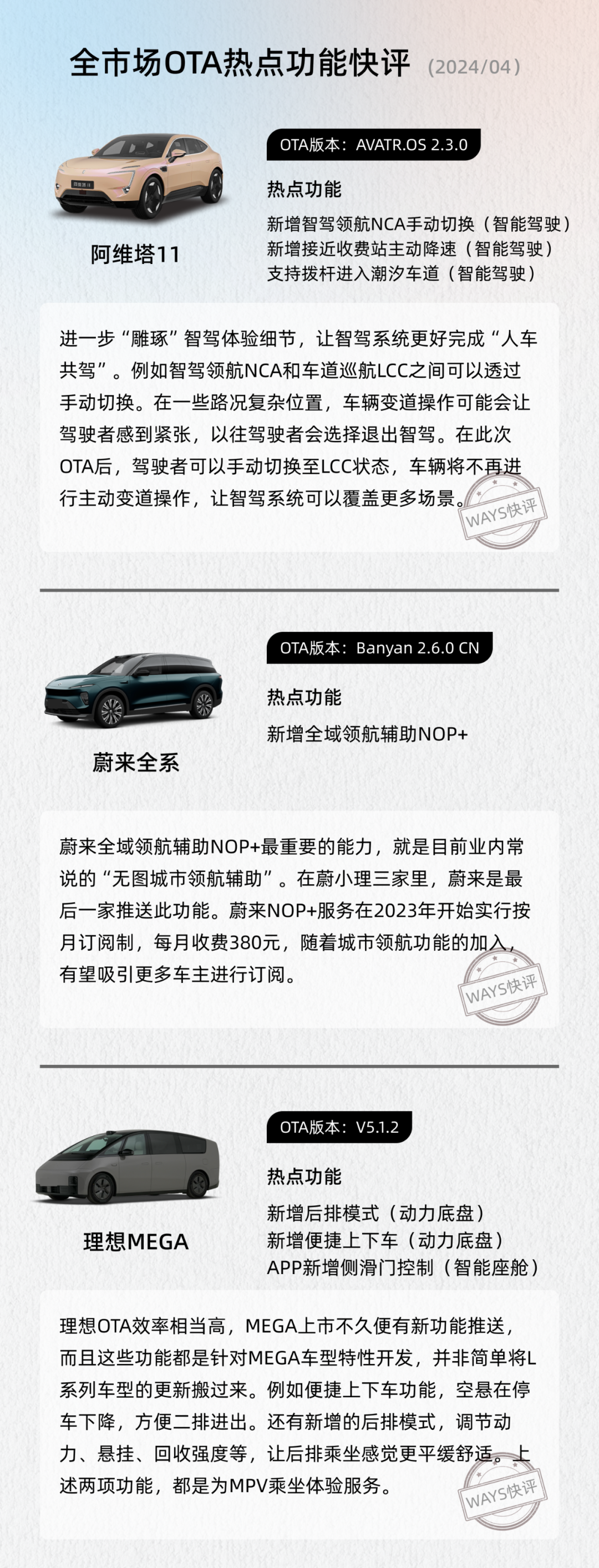 4月OTA总览 | 蔚来终迎全域智驾能力,理想MEGA升级MPV专属功能