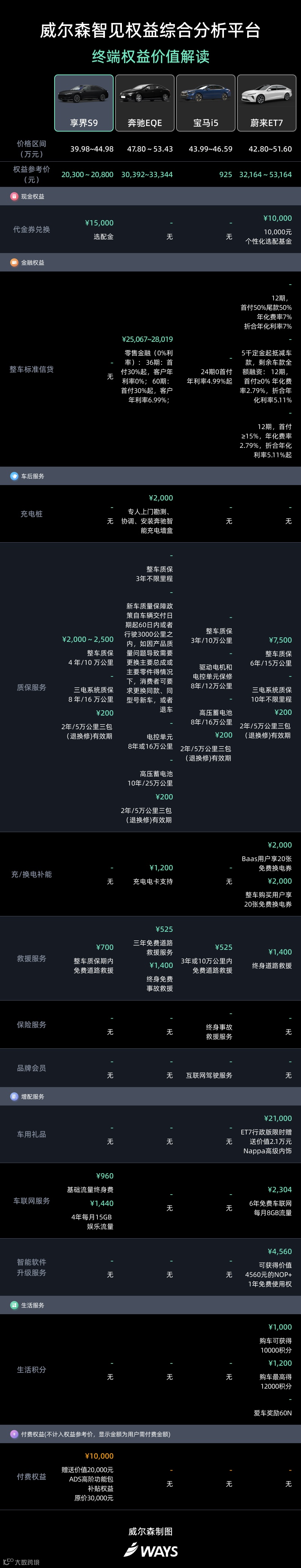 威尔森智见权益综合分析平台,将致力为广大车企提供真实可靠的终端权益价值参考,助力车企完成综合营销竞争力评估对比。更多车型的终端权益数据对比及感知价值,欢迎扫码添加官方微信客服领取免费试用资格。