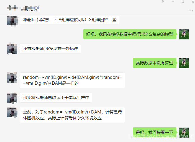 还有同学告诉我, 我之前的培训教程中,计算的母体效应,其实是母体环境效应(仅仅将母体作为随机因子,没有考虑系谱亲缘关系矩阵),我说我知道了,回头我写篇博客解释汇总一下。我看了一下聊天记录:2020年5月10号,这位同学,久等了。