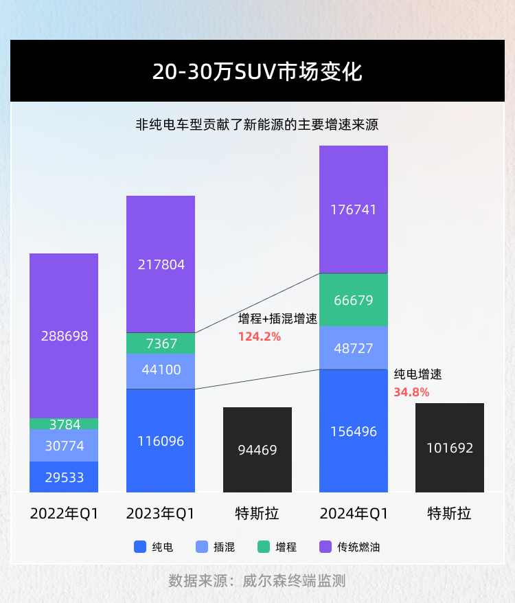 用户续航焦不焦虑?答案是焦虑,20-30万SUV 市场,插混+增程增速去到124.2%,远远大于纯电增速34.8%。