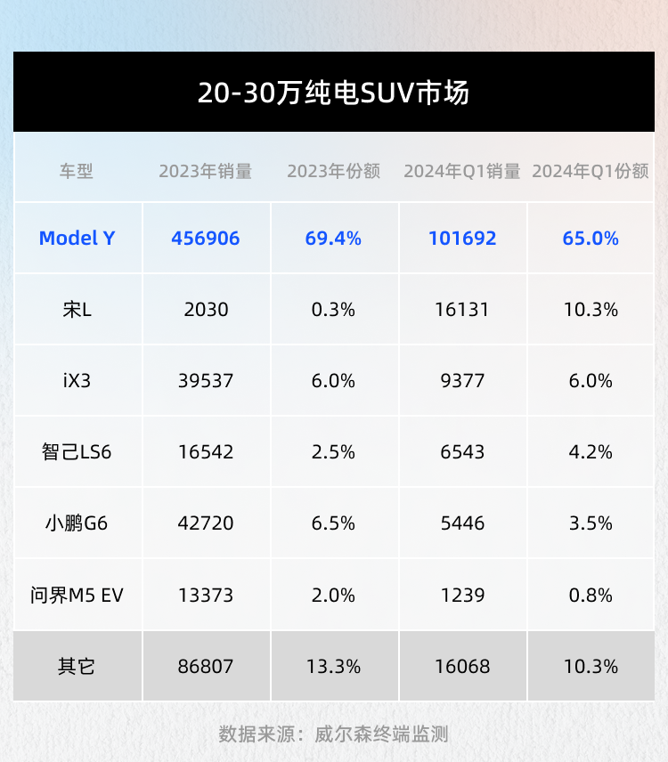 份额排第二的比亚迪宋L,Model Y份额是它的六倍。