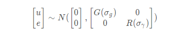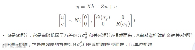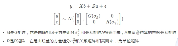 混合线性模型的公式和假定,一般认为随机因子和残差是符合正态分布的,随机因子可以相关(比如系谱关系,SNP构建G矩阵关系),用A矩阵或者G矩阵表示,残差是独立同分布的,矩阵结构一般是单位矩阵。