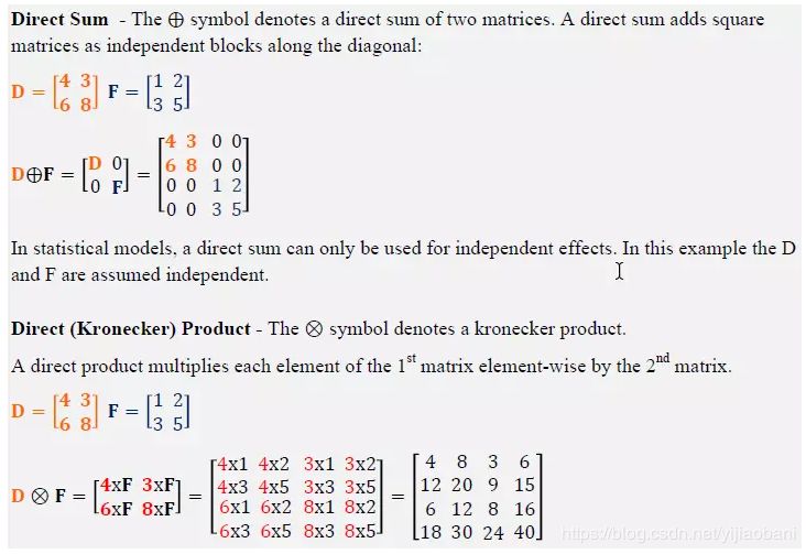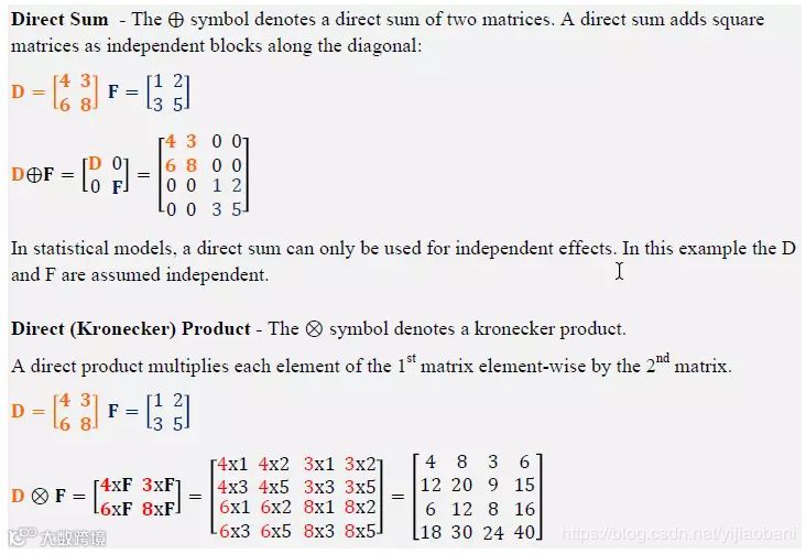 直和(Direct sum)和直积(Direct product)是混合线性模型中经常用到的概念,下面用具体例子介绍直积和直和是如何通过R语言计算的。