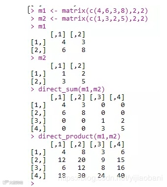 direct_sum<- function(mat1,mat2){r1 <- dim(mat1)[1];c1<- dim(mat1)[2]r2 <- dim(mat2)[1];c2<- dim(mat2)[2]rbind(cbind(mat1,matrix(0,r1,c2)),cbind(matrix(0,r2,c1),mat2))}direct_product <- kronecker