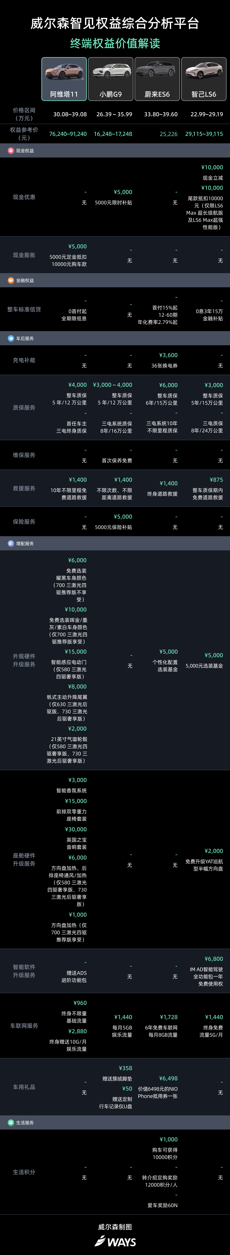 威尔森智见权益综合分析平台,将致力为广大车企提供真实可靠的终端权益价值参考,助力车企完成综合营销竞争力评估对比。更多车型的终端权益数据对比及感知价值,欢迎