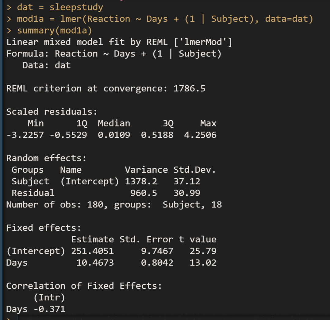 library(lme4)data("sleepstudy")dat = sleepstudymod1a = lmer(Reaction ~ Days + (1 | Subject), data=dat)summary(mod1a)