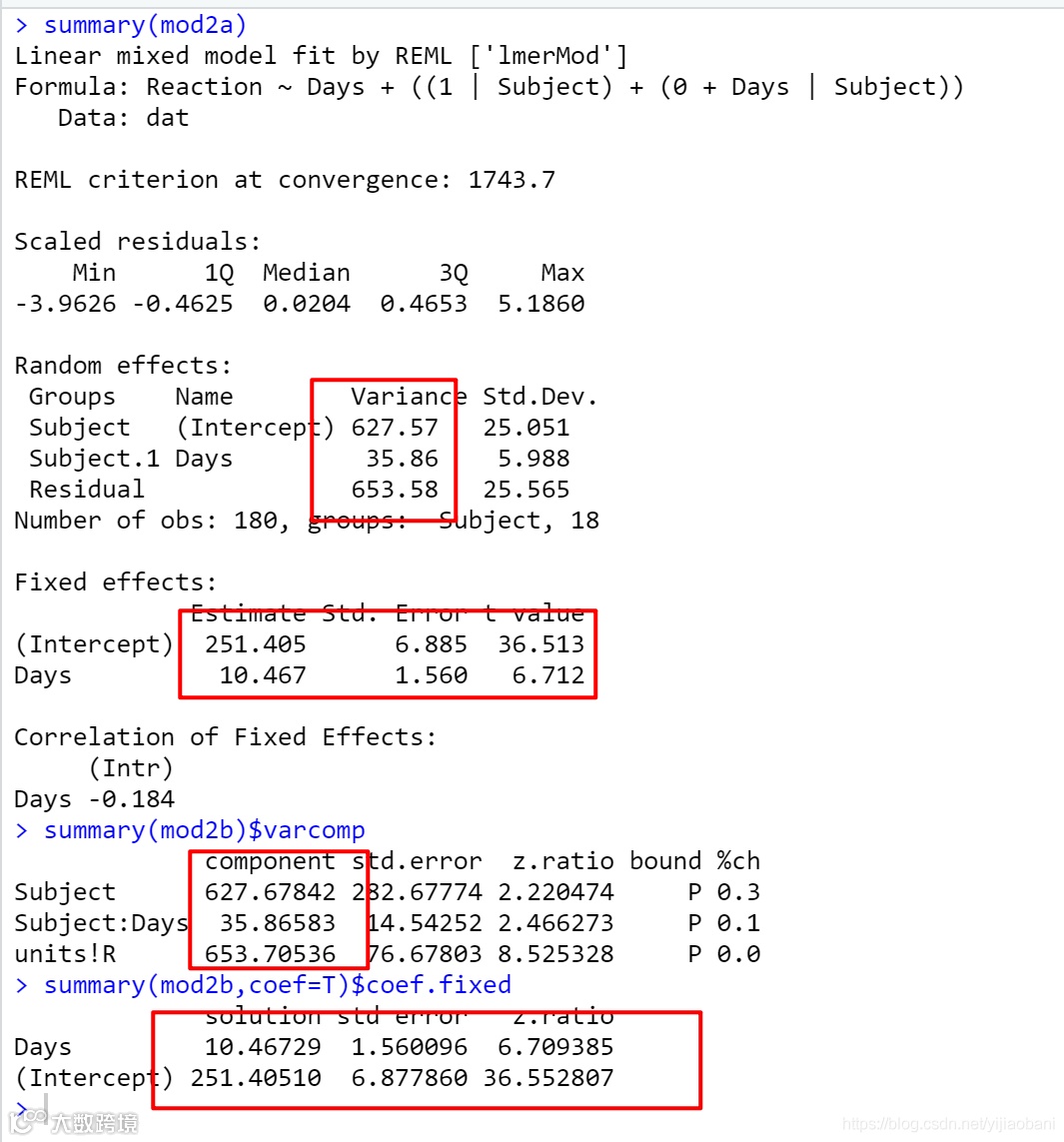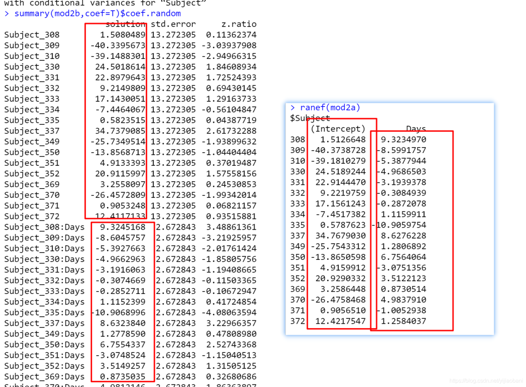 「asreml:」这里,只考虑Subject:Days交互作用,不考虑Subject作为随机因子了。