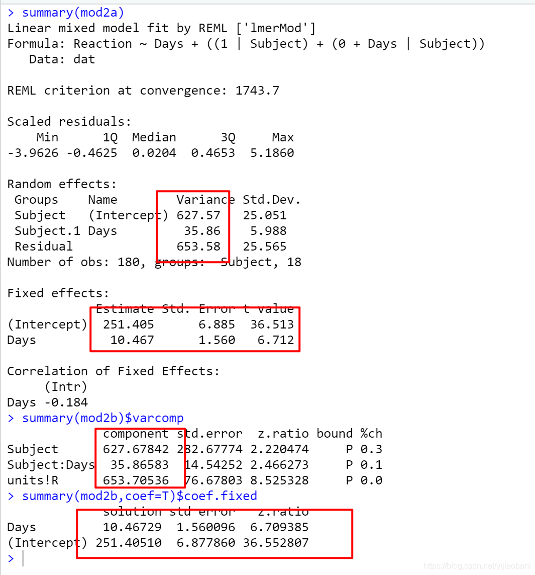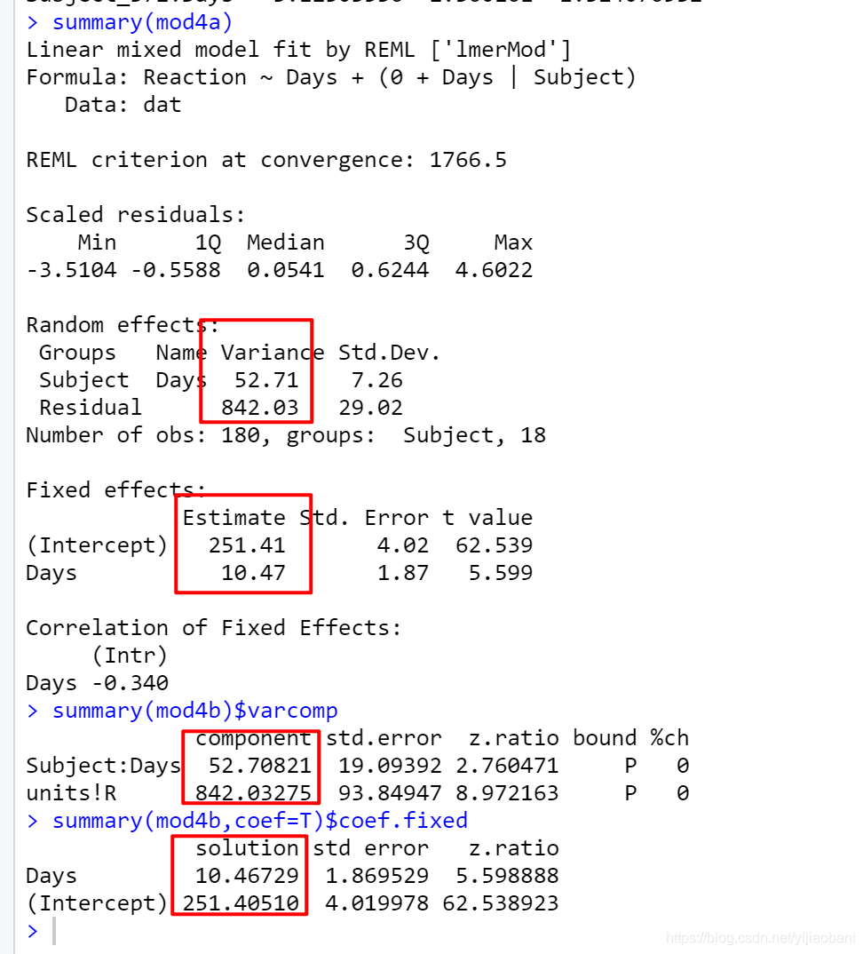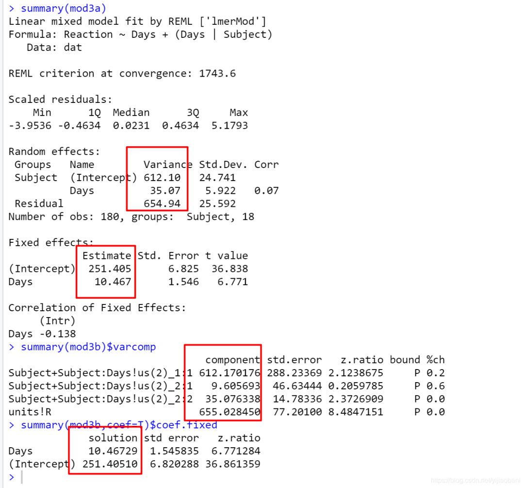 固定因子中,Days为数值协变量,截距的值为251.4,Days的值为10.46