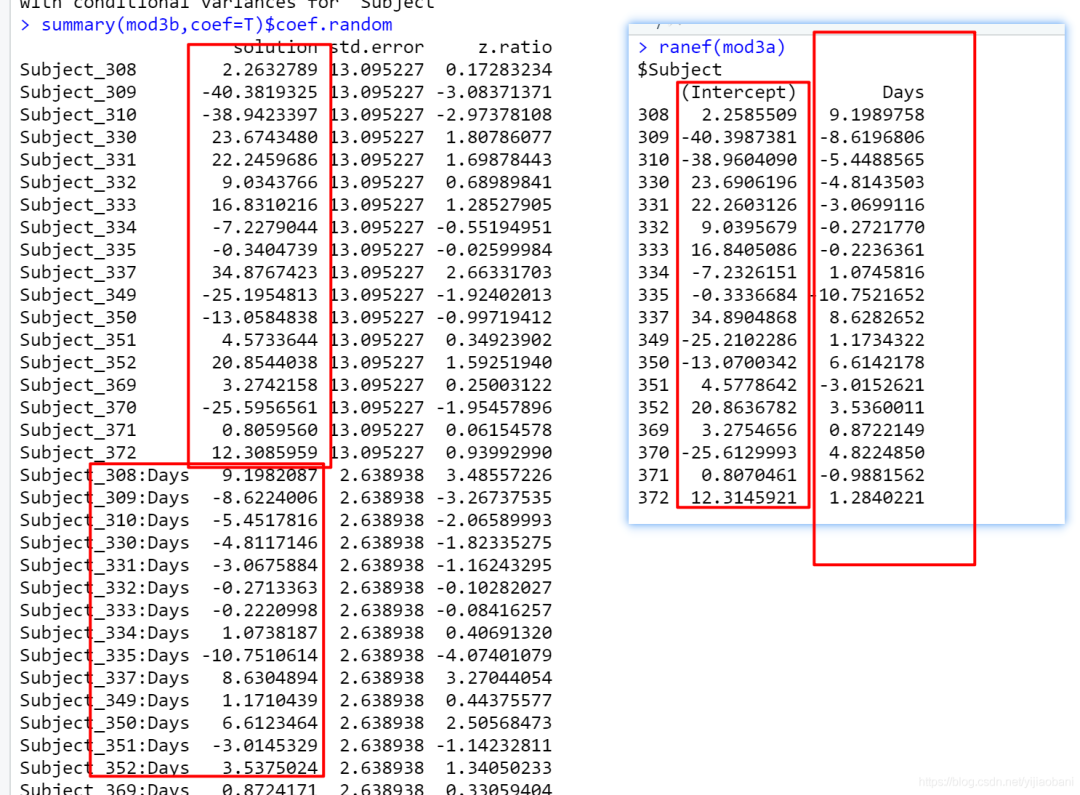 「asreml:」这里,Days是数字变量,Subject/Days,相当于是Subject + Subject:Days,即Subject为随机因子,每个Subject都有一个Days的系数。